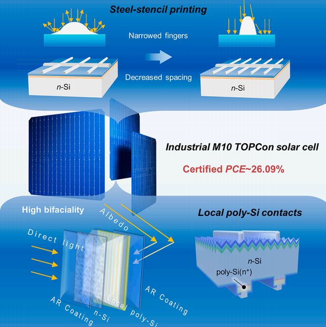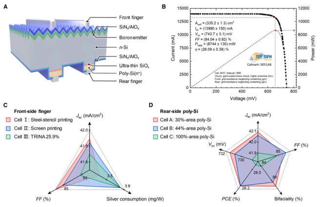 该团队告诉 DeepTech:“需要说明的是,钢网印刷和局部多晶硅设计本身并非由我们首次提出。然而,我们是首次将这两项技术成功集成应用于工业级 TOPCon 电池上,并率先获得了德国哈梅林太阳能研究所认证的 26% 以上效率(在论文投稿时)。因此,最主要的突破在于面向工业量产的技术集成与验证。”